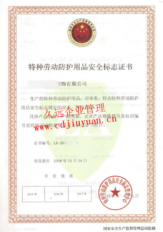 勞動(dòng)防護(hù)用品安全標(biāo)志認(rèn)證證書